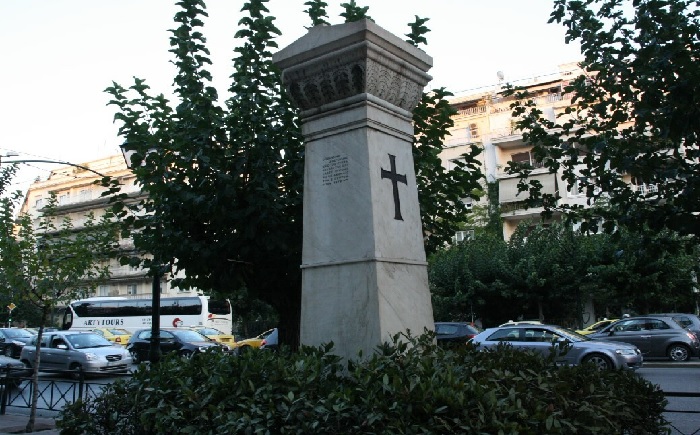 Στο σημείο όπου, στις 31 Ιουλίου/13 Αυγούστου 1920, δολοφονήθηκε ο Ίων Δραγούμης, στήθηκε το επόμενο έτος μια κομψή βυζαντινότροπη, μαρμάρινη αναθηματική στήλη, φιλοτεχνημένη από τον αρχιτέκτονα Αριστοτέλη Ζάχο, φίλο του νεκρού πολιτικού, λογοτέχνη και οραματιστή.