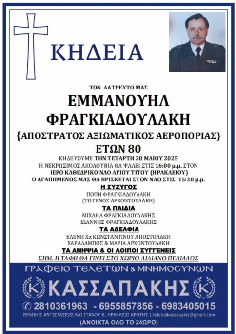 Ασμχος (ΤΥΤ) ε.α. Φραγκιαδουλάκης Εμμανουήλ του Μιχαήλ. Γεννήθηκε στο Λιλιανό Πεδιάδος Ηρακλείου Κρήτης το 1945 και ήταν κάτοικος εν ζωή Ηρακλείου Κρήτης.