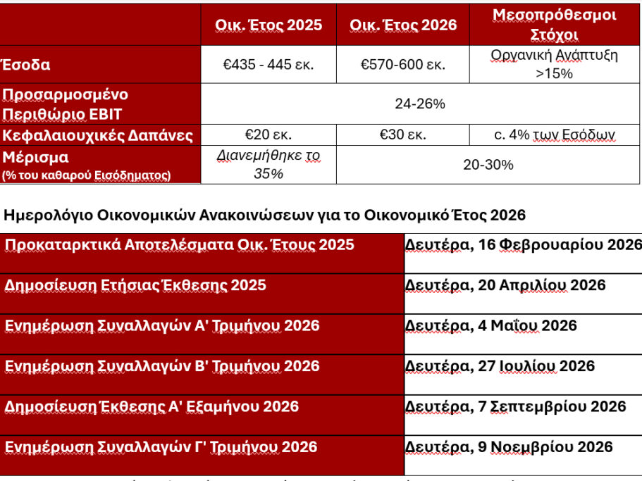 Με την εταιρία να βρίσκεται σε τροχιά επίτευξης ιστορικών εσόδων και κερδών για το Οικονομικό Έτος 2025 και με ευνοϊκές συνθήκες δυναμικής στην αγορά, εισερχόμαστε στο 2026 με ισχυρή ώθηση και δεν αναμένουμε σημάδια επιβράδυνσης στο άμεσο μέλλον.